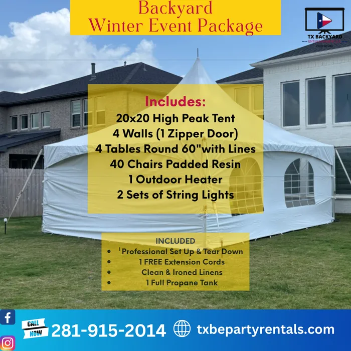 Setup and teardown services include tents, tables, chairs (as determined by TX Backyard Entertainment LLC based on tent size and layout), and string lighting when included in the selected package. Setup of table covers, linens, and decorative items is not included. All linens will be delivered professionally washed, ironed, and on hangers for client placement on the event day. Tent installations are typically completed 1–2 days prior to the scheduled event date. Installation timing may vary based on weather, site conditions, access, and scheduling.